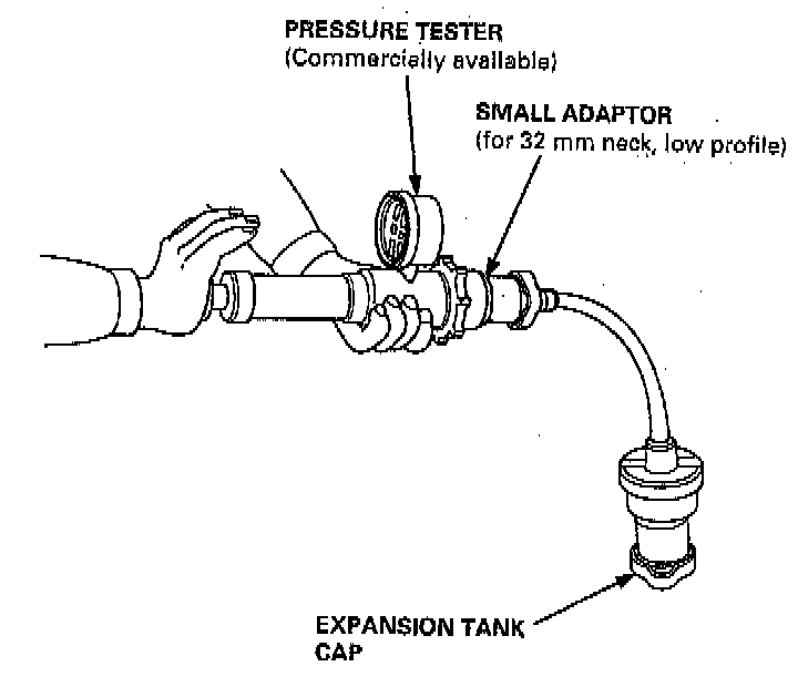 1. Remove the expansion tank cap, wet its seal with engine coolant, then install it on the pressure tester.2. Apply a pressure of 93 - 123 kPa (14 - 18 psi).
