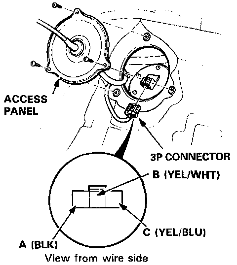 5. If the light did not come on in step 3 remove the rear bulkhead panel behind the driver's seat, then remove the access panel, and disconnect the 3P connector from the fuel gauge sending unit. Connect the A (BLK) terminal to the C (YEL/BLU) terminal with a jumper wire.