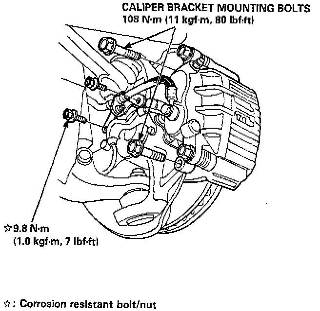 6. Remove the caliper bracket mounting bolts, and hang the caliper assembly to one side.
