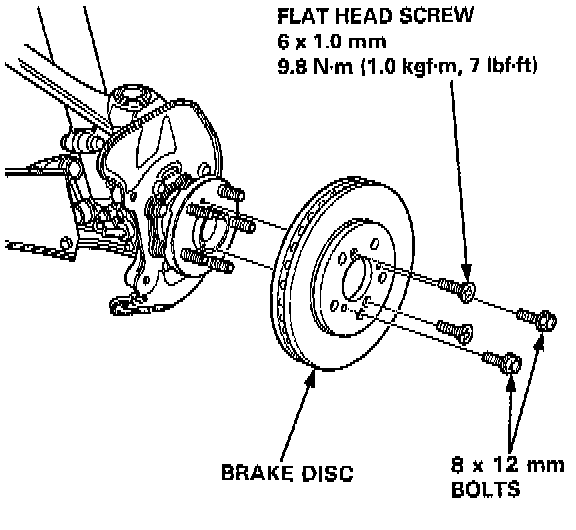 7. Remove the flat head screws. Install two 8 x 12 mm bolts into the disc to push it away from the hub.