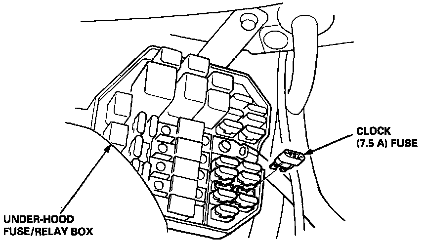 - Turn the ignition switch OFF. Remove the CLOCK (7.5 A) fuse from the under-hood fuse/relay box for 10 seconds.