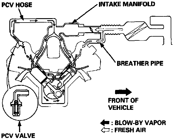 The Positive Crankcase Ventilation (PCV) system is designed to prevent blow-by gas from escaping to the atmosphere. The PCV valve contains a spring-loaded plunger. When the engine starts, the plunger in the PCV valve is lifted in proportion to intake manifold vacuum and the blow-by gas is drawn directly into the intake manifold.