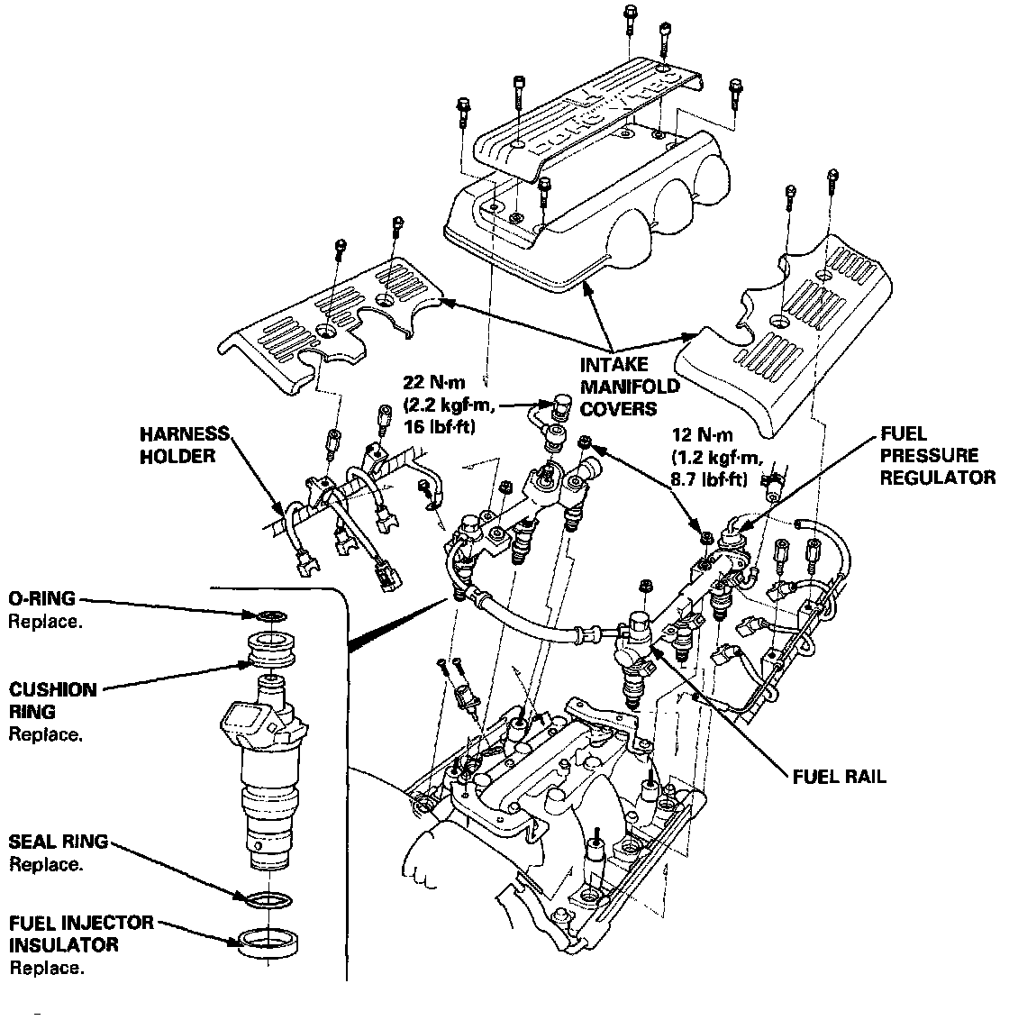 6. Remove the retainer nuts from the fuel rail and harness holder.
