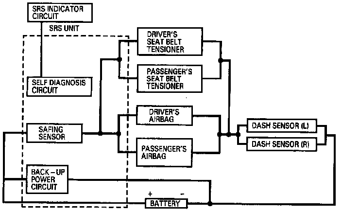 As shown in the diagram, the left and right dash sensors are connected in parallel. The parallel set of sensors is connected in series to each airbag inflator circuit and the vehicle battery. In addition, a back-up power circuit is connected in parallel with the vehicle battery. The back-up power circuit and the safing sensor are located inside the SRS unit.