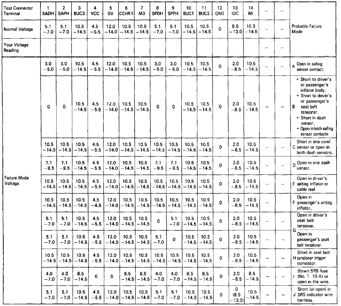 - If resistance is less than 5 K-ohms, the SRS unit is faulty. Substitute a known-good SRS unit, and recheck the voltages according to the chart.