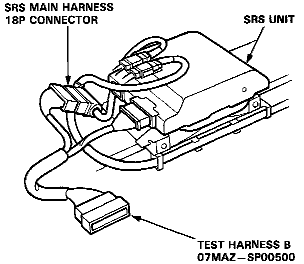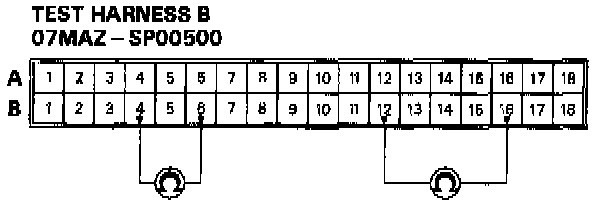 2. Connect the test harness B between the SRS unit and the SRS main harness 18P connector. Check the resistance between the left dash sensor terminals B12 and B16, and between the right dash sensor terminals B4 and B6.