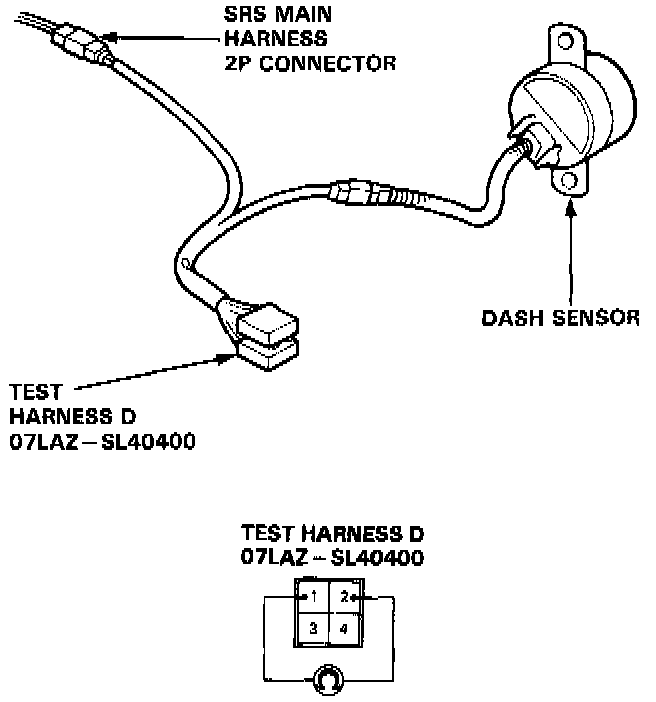 3. Connect test harness D between the dash sensor and SRS main harness 2P connector. Check the resistance between the No.1 terminal and No.2 terminal.