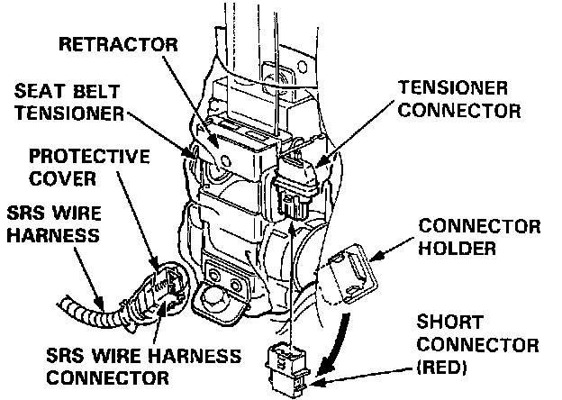 - Remove the short connector (RED) from the its holder and disconnect the SRS wire harness connector, then connect the short connector (RED) to the tensioner connector.