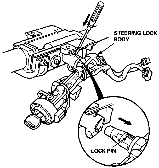 1. Turn the key to "I", push the pin, and insert the steering lock assembly into the steering column until it clicks into place.