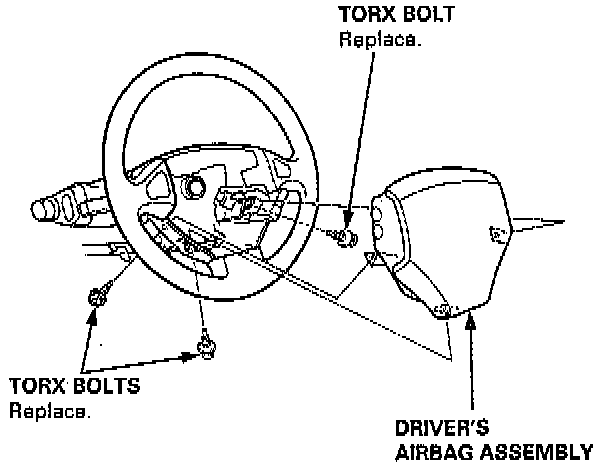 CAUTION: If an intact driver's airbag assembly has been removed from a scrapped vehicle or has been found defective or damaged during transit, storage or service, it should be deployed. Carefully inspect the driver's airbag assembly before installing. Do not install an driver's airbag assembly that shows signs of being dropped or improperly handled, such as dents, cracks or deformation. Always keep the short connector on the airbag 3P connector when the harness is disconnected. Do not disassemble or tamper with the driver's airbag assembly. Refer to Air Bags and Seat Belts.