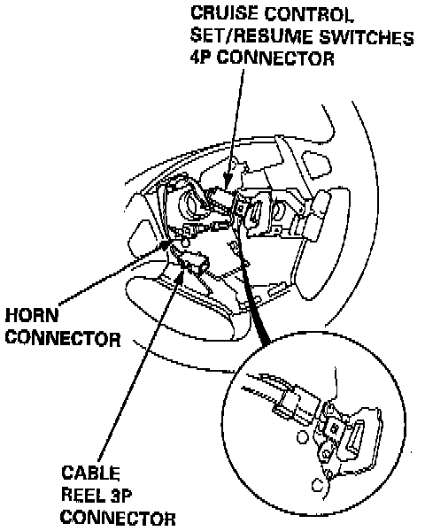 7. Disconnect the connectors from the horn and cruise control set/resume switches, then remove the cable reel 3P connector from its clips.