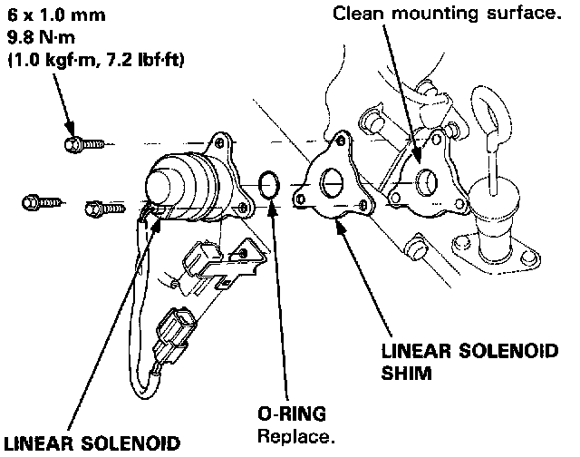 - After installation, wipe off any liquid gasket that squeezed out from around the linear solenoid shim.