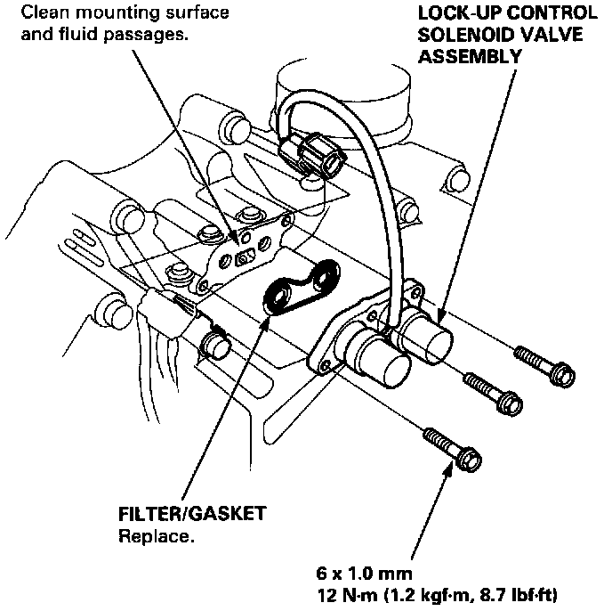 2. Clean the mounting surface and fluid passages of the lock-up control solenoid valve assembly, then install a new lock-up control solenoid valve assembly with a new filter/gasket.