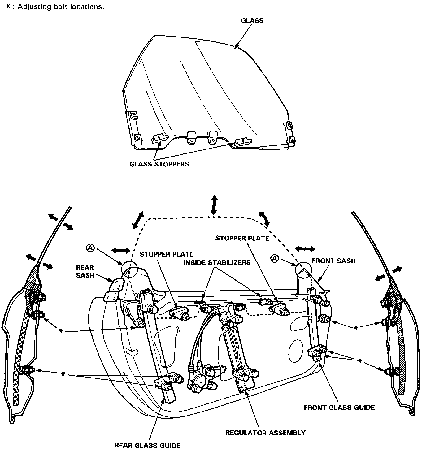 Glass AdjustmentNOTE: Take care not to damage location (A) on the front and rear sashes.