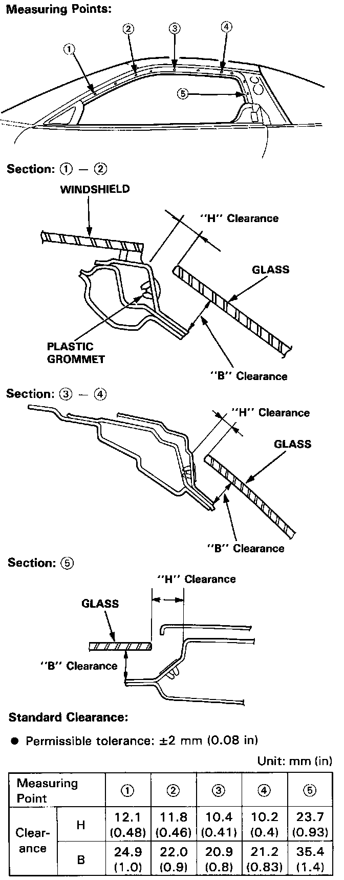 6. Measure and record the clearance "H" and "B" between the glass and body at the locations shown.