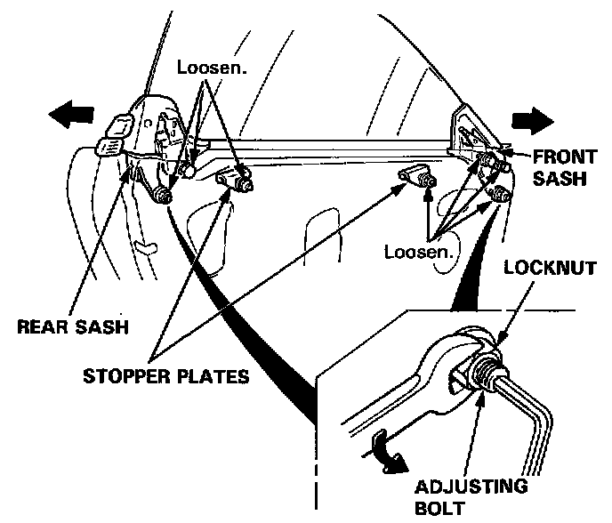 a. Loosen the bolts and nuts securing the front sash, rear sash and stopper plates, then move the front sash all the way forward and move the rear sash all the way backward.