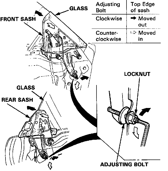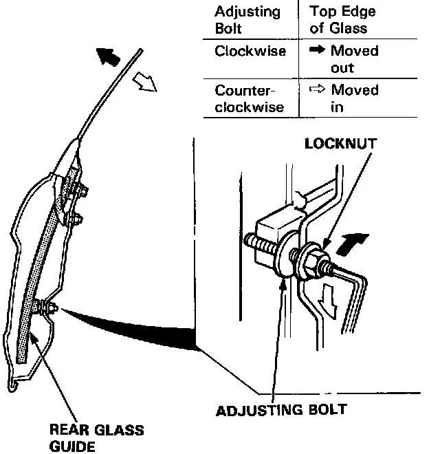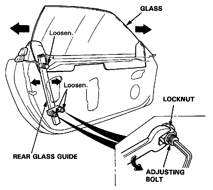 NOTE: Turn the front and rear adjusting bolts the same amount so as to keep the glass guide bracket parallel with the seating surface of the door. After tightening the adjusting bolts, make sure that the ends of the adjusting bolts still project out of the locknuts.