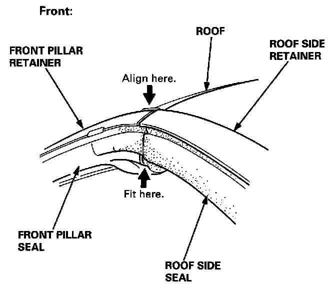 NOTE: Align the roof side retainer with the front pillar retainer and rear pillar panel evenly on each side, and make the seals fit flush.