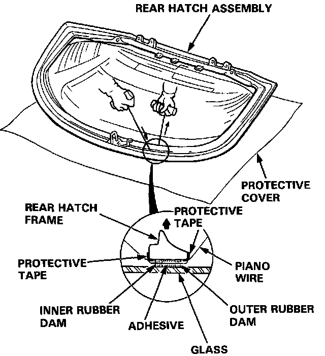 1. Use a putty knife to scrape off all traces of old adhesive and outer/inner rubber dams, then clean the rear hatch frame and glass (new) surface with alcohol where new adhesive is to be applied.