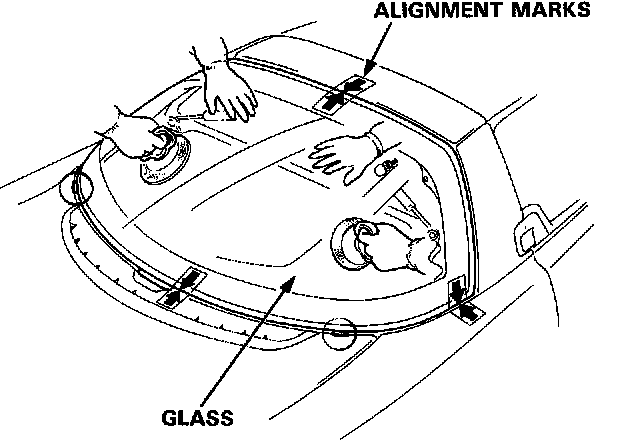 4. Place the glass gently on the rear hatch frame, then center it in the opening. Make alignment marks by marking lines across the glass and body with a grease pencil at the four points shown.