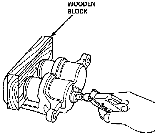 2. If necessary, apply compressed air to the caliper fluid inlet to get the pistons out. Place a shop rag or wooden block as shown to cushion the pistons when they are expelled. Use low pressure air in short spurts.