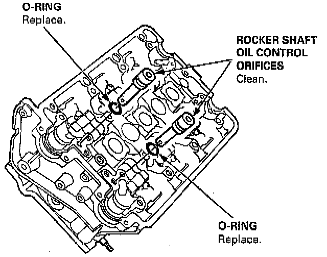 3. Install the orifices. If the holes in the rocker arm shafts and the cylinder head are not in line with each other, use a 12 x 1.25 mm bolt in the rocker arm shaft to rotate the shaft.