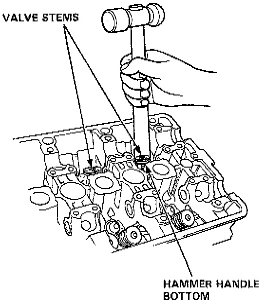 - When valves and springs are in place, lightly tap the end of each valve stem two or three times to ensure proper seating of valve and valve keepers (use hammer handle bottom).