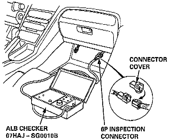 2. Disconnect the ABS inspection connector (6P) from the cross-member under the passenger's seat and connect the ABS inspection connector (6P) to the Anti-lock Brake (ALB) checker.