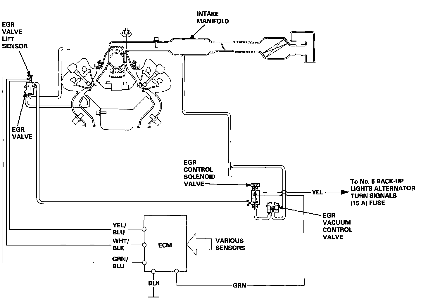 The ECM contains memories for ideal EGR valve lifts for varying operating conditions. The EGR valve lift sensor detects the amount of EGR valve lift and sends the information to the ECM. The ECM then compares it with the ideal EGR valve lift which is determined by signals sent from the other sensors. If there is any difference between the two, the ECM varies current to the EGR control solenoid valve to regulate vacuum applied to the EGR valve.