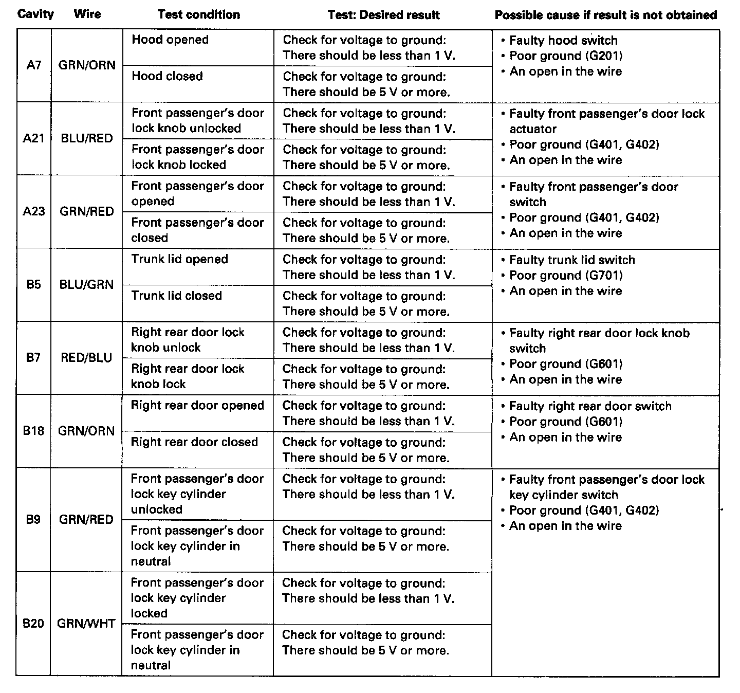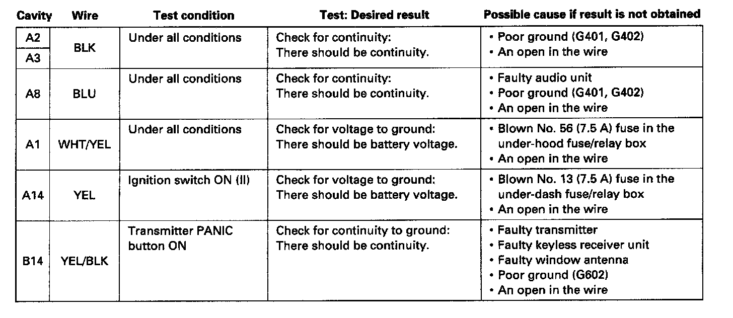 - If the terminals look OK, make the input tests as shown in the table at the connector.