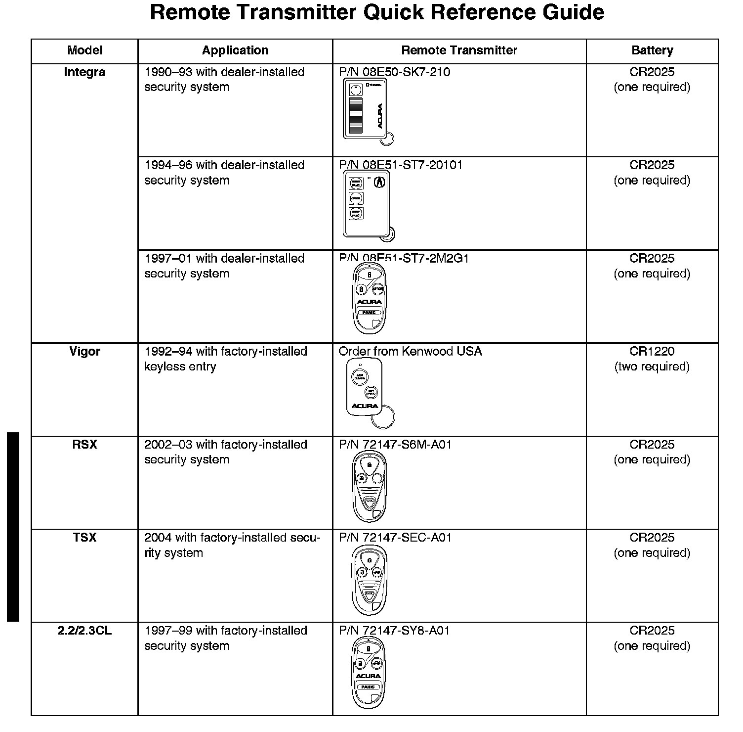 This service bulletin gives you information about keyless remote transmitters for most Acura vehicles. Each procedure describes transmitter programming (if applicable), transmitter ordering, and transmitter batteries. A transmitter quick reference guide shown.