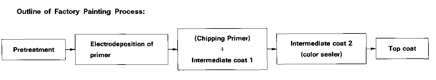In the pretreatment process, the entire body is degreased, cleaned, and coated with zinc phosphate by dipping. After the body has been cleaned with pure water, it is placed in an electrolytic bath of soluble primer (Cationic Electrodeposition). This produces a thorough corrosion inhibiting coating on the inner surface and corners of the body, pillars, sills, and panel joints. Chipping primer is then applied to the most susceptible area.