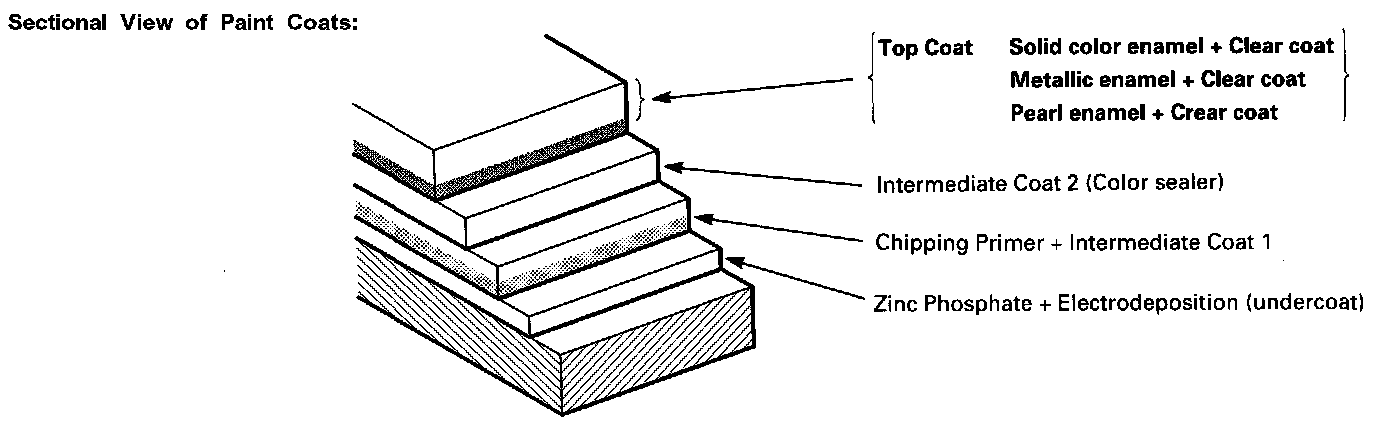 To repair paint damage, always use the 2-part acylic urethane paints designated; polish and bake each of the three coats, as in production, to maintain the original film thickness, and to assure the same quality as the original finish.