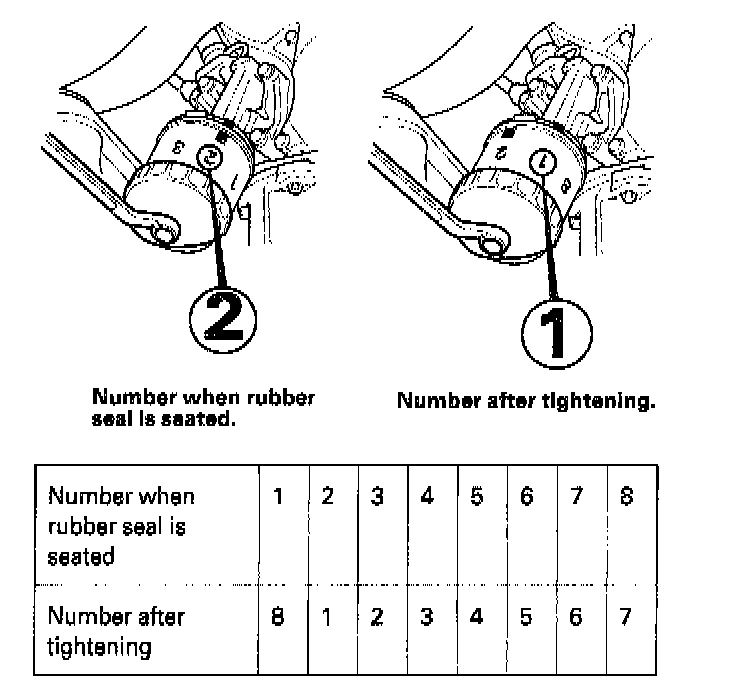 - Tighten the filter by turning it clockwise seven numbers from the one you noted. For example, if number 2 is at the bottom when the seal is lightly seated, tighten the filter until the number 1 comes around to the bottom.