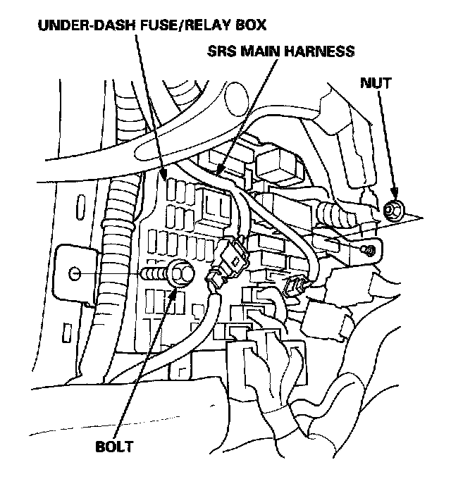 4. Disconnect the connectors from the under-dash fuse/ relay box, including the SRS main harness.