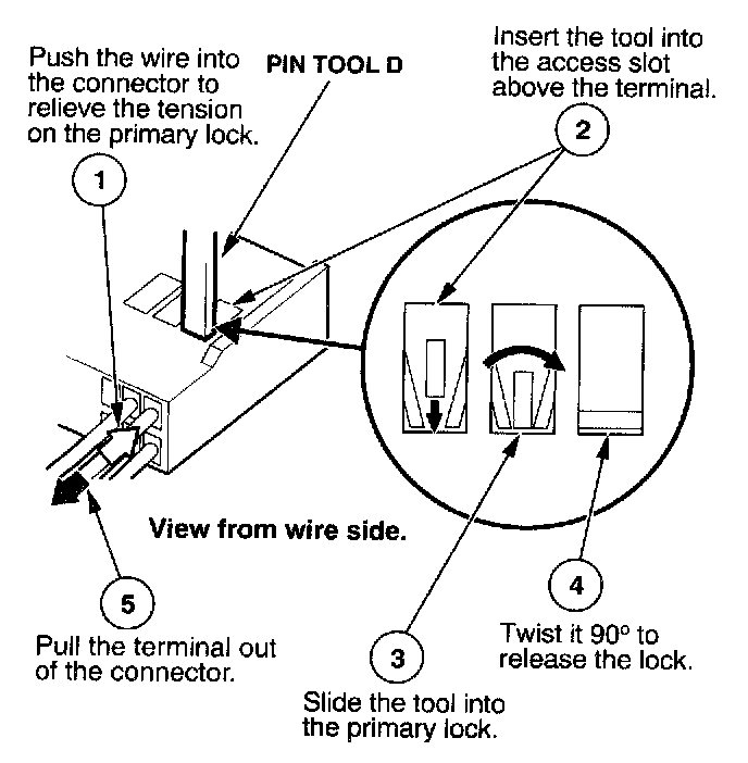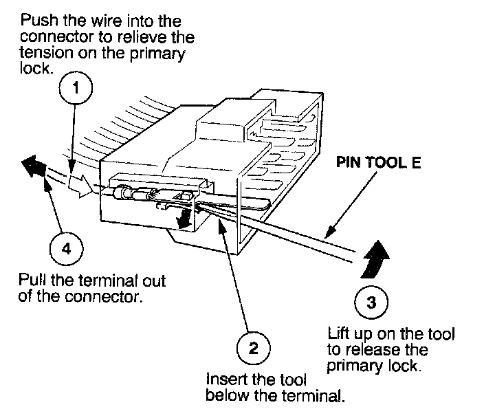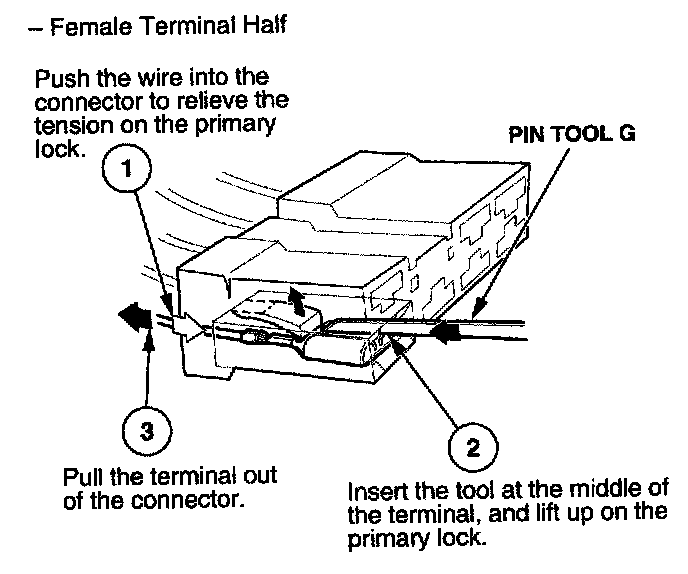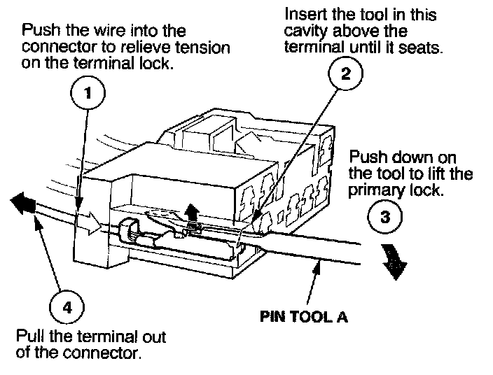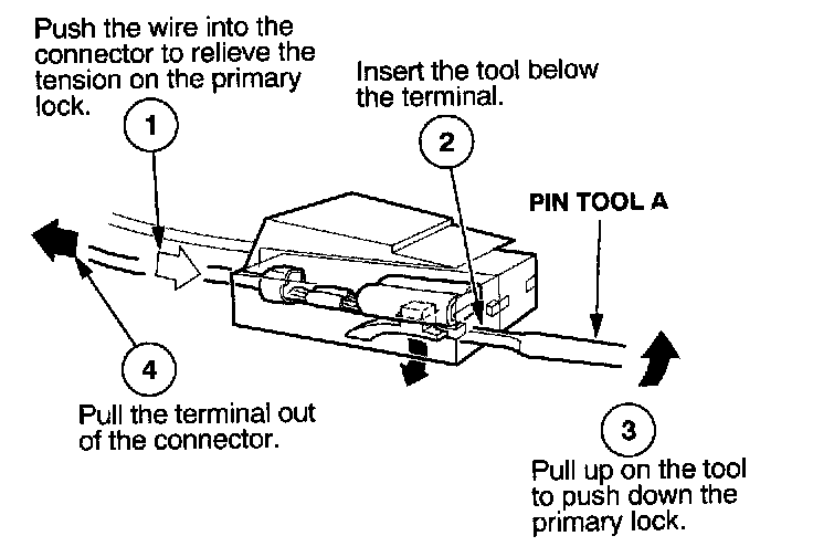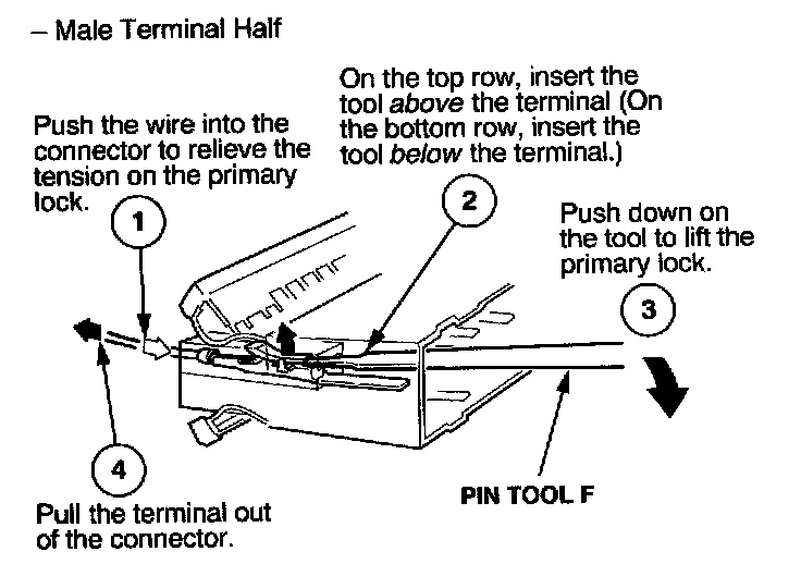 Before you begin, inspect the wire you are about to repair for damage and length. Make sure the wire will be long enough to make a terminal repair without stretching it when you reinstall the terminal in the connector. If the wire is too short, or if access to the connector is too restricted to make a terminal repair, you may need to install a pigtail terminal (a short length of wire with a factory-crimped terminal on it). Refer to HOW TO INSTALL PIGTAIL TERMINALS.