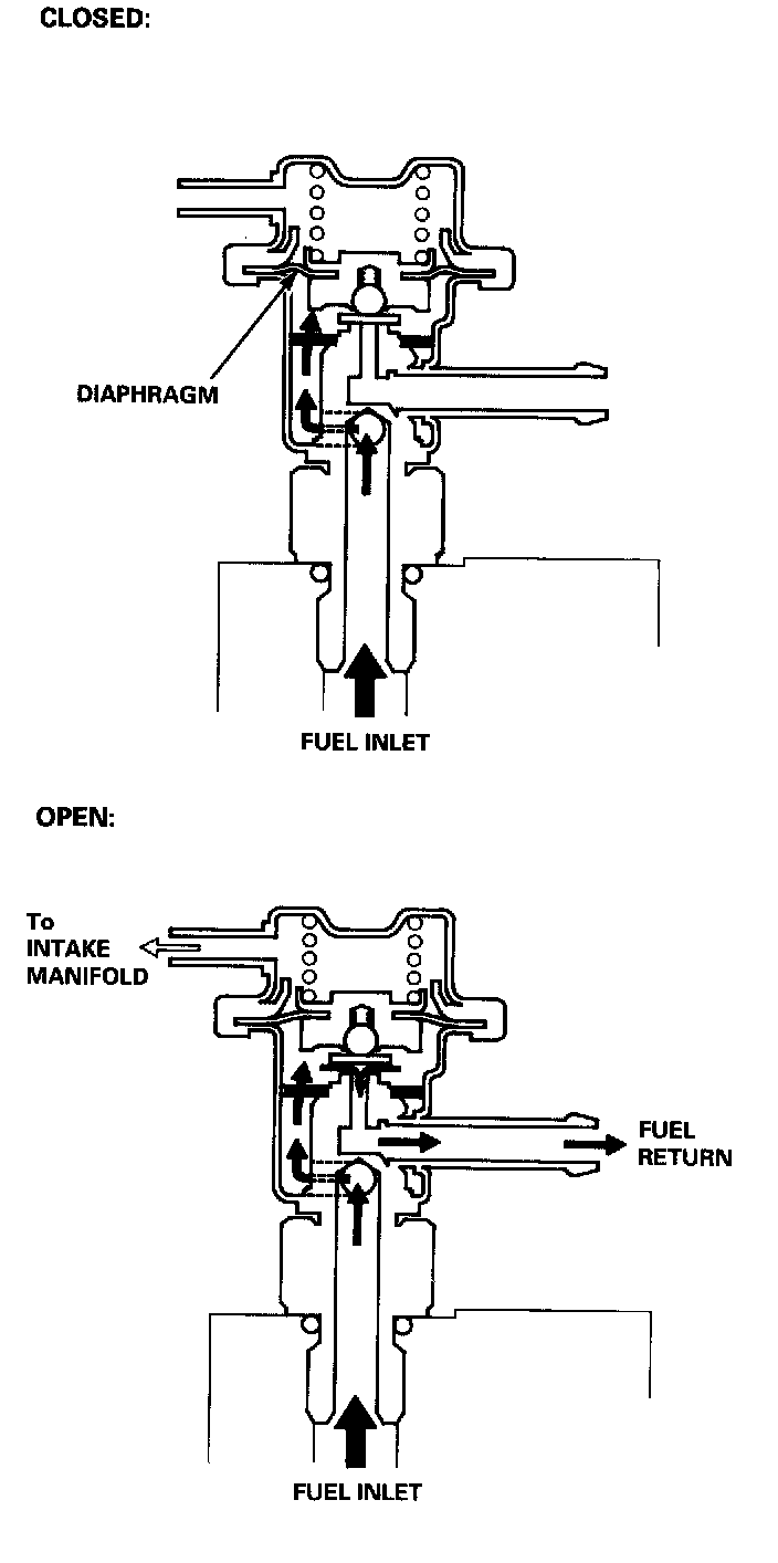 The fuel pressure regulator maintains a constant fuel pressure to the injectors. When the difference between the fuel pressure and manifold pressure exceeds 294 kPa (3.0 kgf/sq.cm, 43 psi), the diaphragm is pushed upward, and the excess fuel is fed back into the fuel tank through the return line.