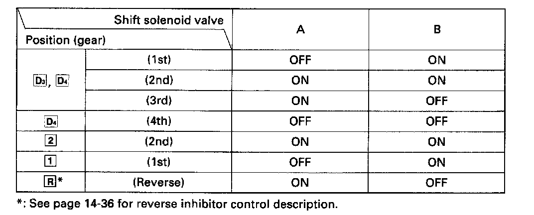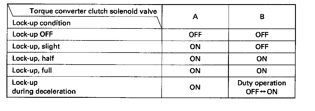 From sensor input signals, the PCM determines whether to turn the lock-up ON or OFF and activates torque converter clutch (lock-up control) solenoid valve A and/or B accordingly. The combination of driving signals to torque converter clutch (lock-up control) solenoid valves A and B is shown in the table.