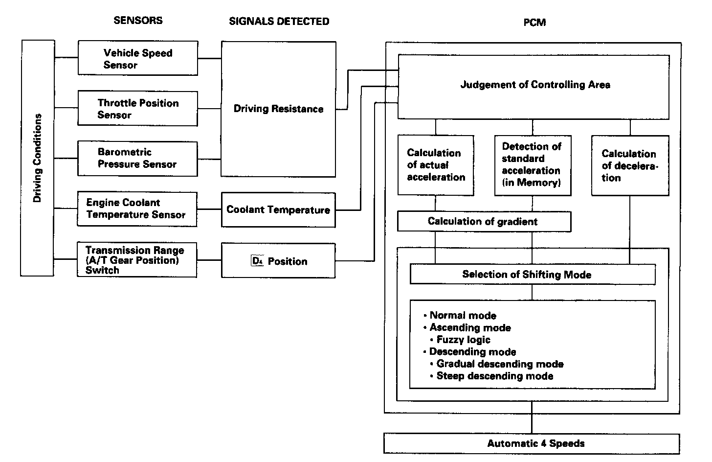 The PCM compares actual driving conditions with driving conditions memorized in the PCM, based on the input from the vehicle speed sensor, throttle position sensor, engine coolant temperature sensor, barometric pressure sensor, brake pedal position switch signal and shift lever position signal, to control shifting while a vehicle is ascending or descending a slope.
