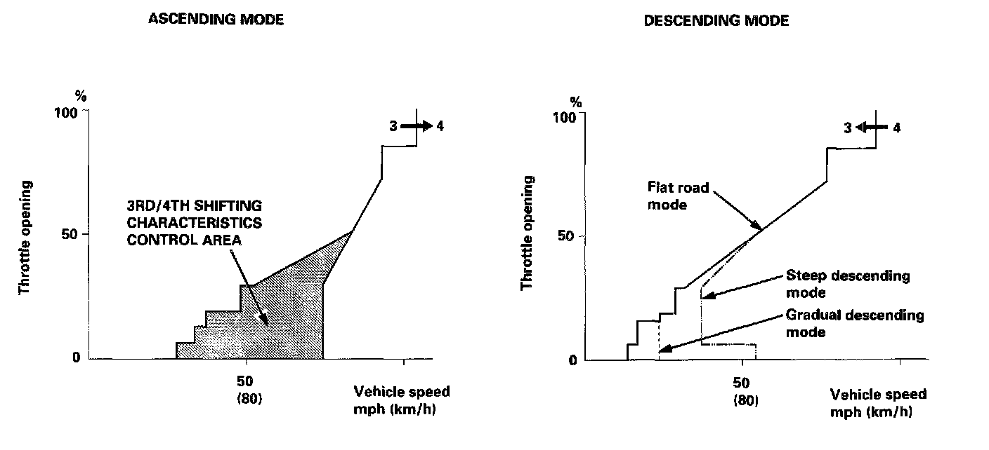 When the PCM determines that the vehicle is going down a hill in D4 position, the shift-up speed from 3rd to 4th gear when the throttle is closed becomes faster than the set speed for flat road driving to widen the 3rd gear driving area. This, in combination with engine braking from the deceleration lock-up, achieves smooth driving when the vehicle is descending. There are two descending modes with different downshift (4-3) schedules according to the magnitude of a gradient stored in the PCM. When the vehicle is in 4th gear, and you are decelerating on a gradual hill, or when you are applying the brakes on a steep hill, the transmission will downshift to 3rd gear. When you accelerate, the transmission will then return to 4th gear.