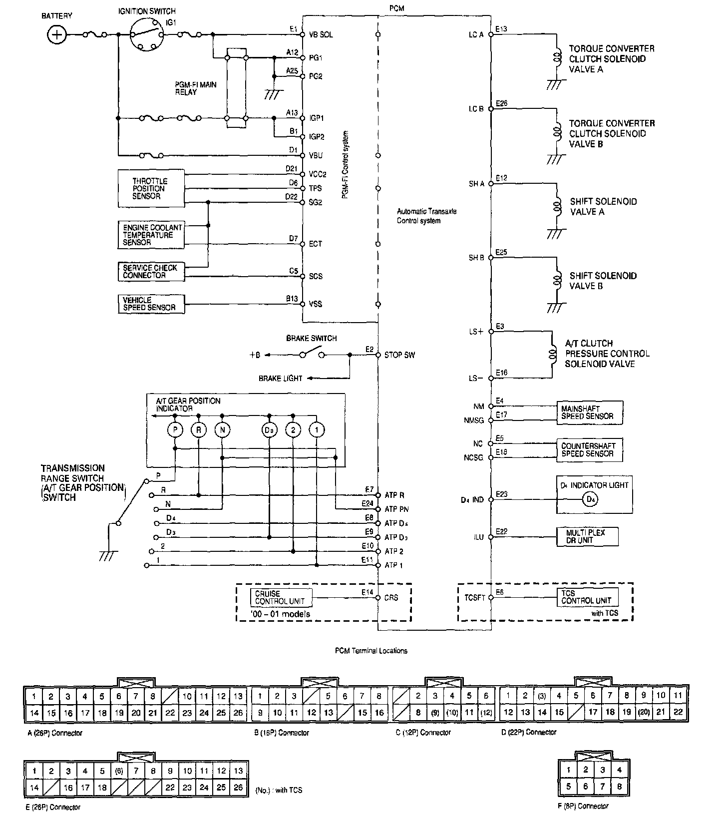 The electronic control system consists of a Powertrain Control Module (PCM), sensors, a A/T clutch pressure control solenoid and four solenoid valves. Shifting and lock-up are electronically controlled for comfortable driving under all conditions. The PCM is located below the dashboard, under the front lower panel on the passenger's side.