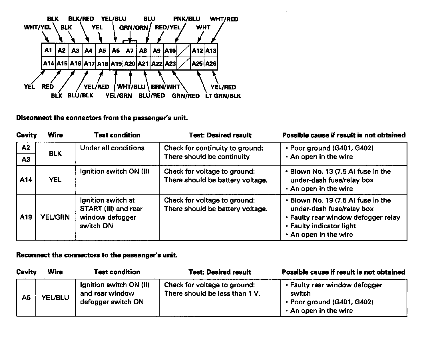 - If the terminals look OK, make the input tests as shown in the table at the connector.