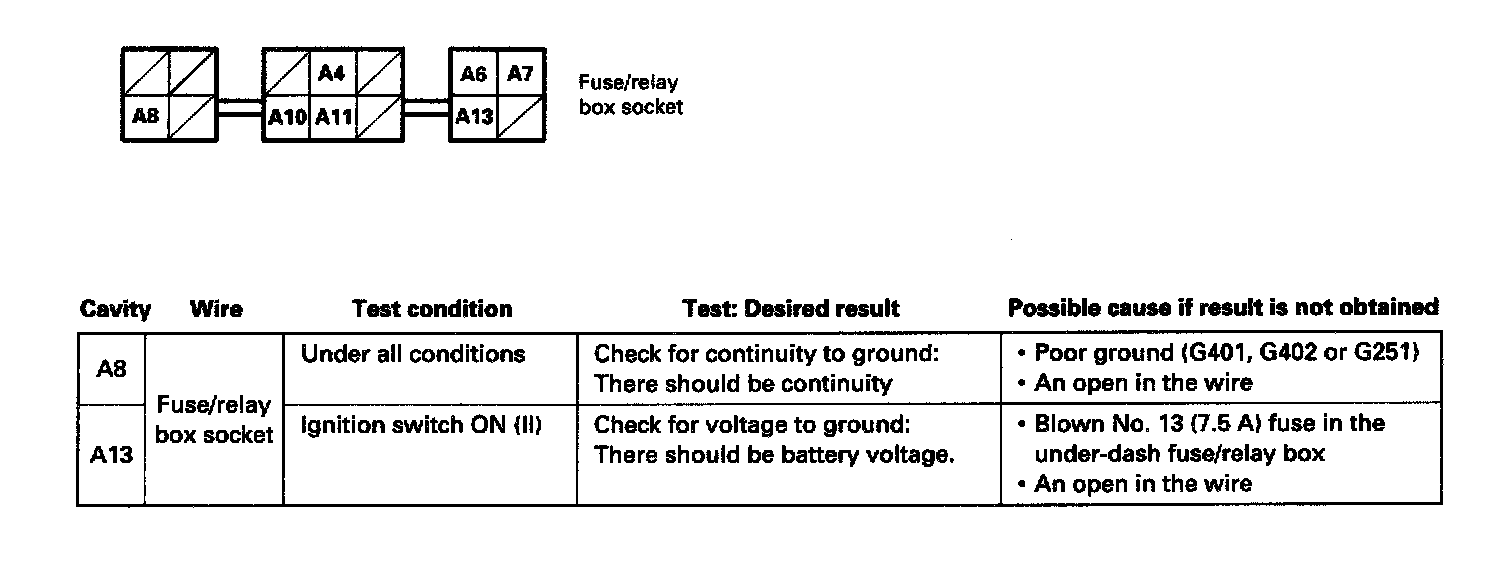 - If the terminals look OK, make the input tests as shown in the table at the connector and the fuse/relay box socket.