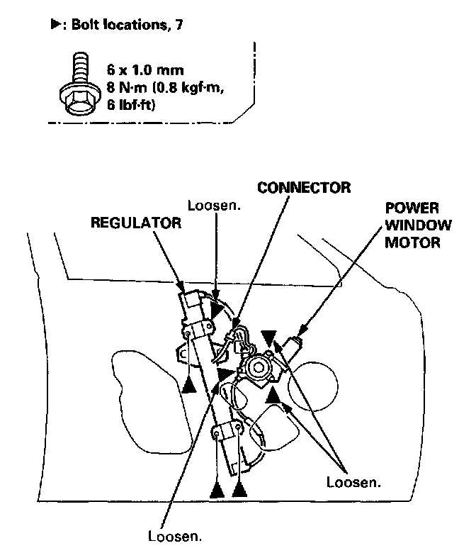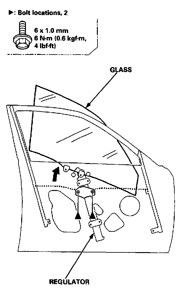 3. Disconnect the connector, then remove the regulator through the hole in the door.