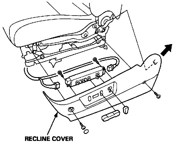 1. Remove the recline cover from the driver's seat by removing the two screws, and pulling off the adjustment switch knobs.
