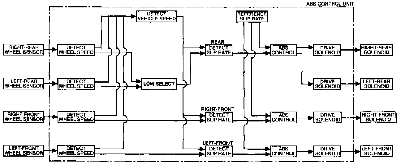 The ABS control unit calculates the slip rate of each wheel, and it transmits the control signal to the modulator unit solenoid valve when the slip rate is high.