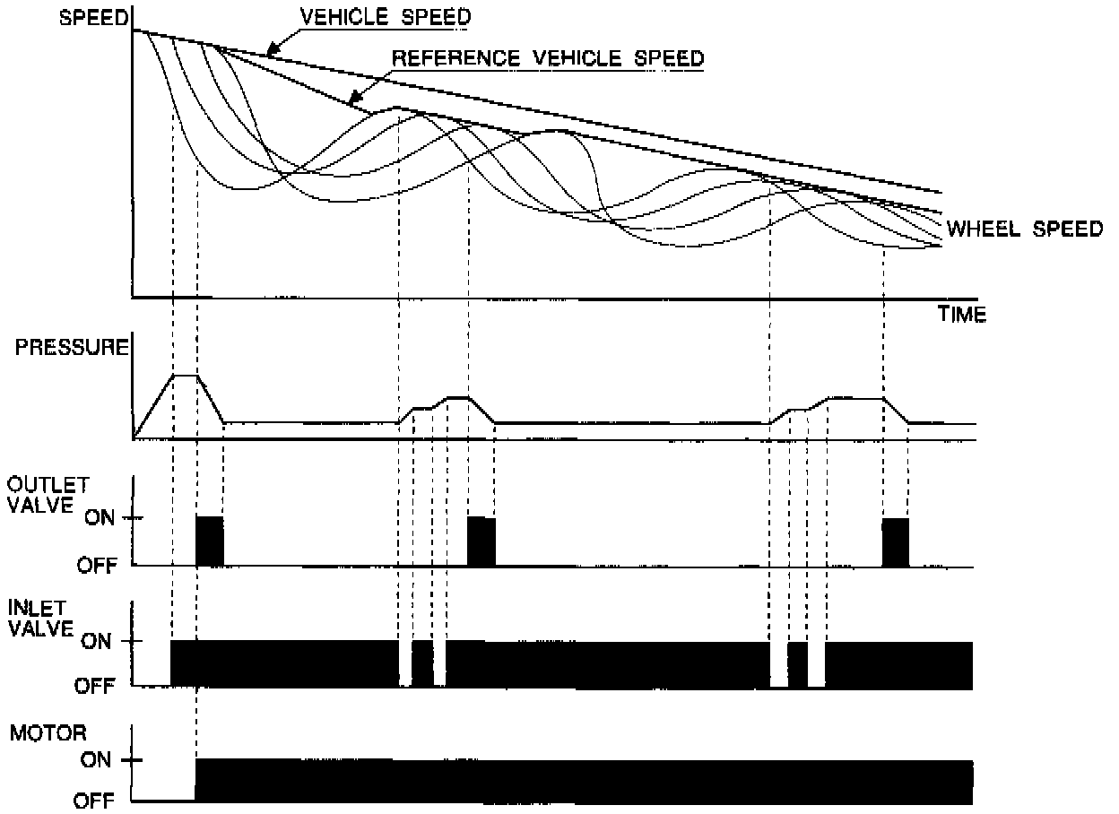 When the wheel speed drops further, the outlet valve opens momentarily to reduce the caliper fluid pressure. The pump motor starts at this time.