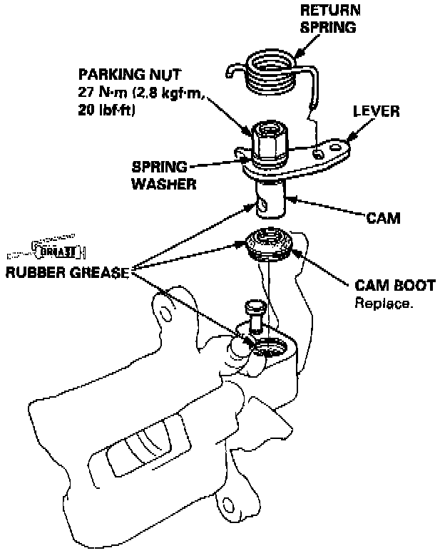 - When the cam and lever were separated, be sure to assemble them before installing the cam in the caliper body. Install the lever and spring washer, apply locking agent to the threads, and tighten the parking nut while holding the lever with a vise.