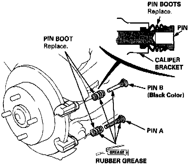 17. Apply the recommended rubber grease in the caliper seal set to the sliding surface of the pins and inside of the new pin boots.