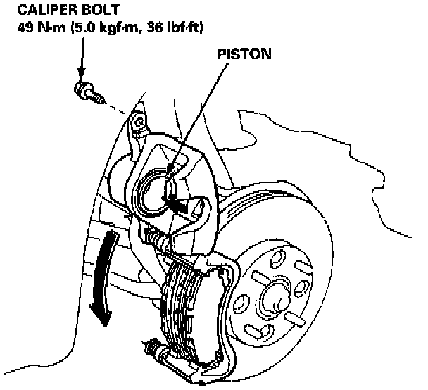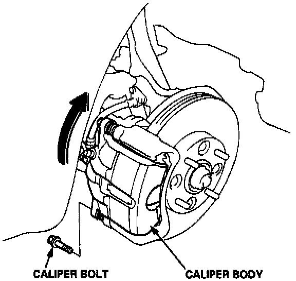 2. Remove the caliper bolt, and pivot the caliper up out of the way.